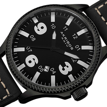 Black stainless steel case with a black leather strap. Fixed black bezel. Black dial with black with luminous fill hands and indexes and Arabic numeral hour markers. Minute markers around the outer rim. Dial Type: Analog. Luminescent hands and markers. Date display between 4 and 5 o'clock position. Quartz movement. Scratch resistant mineral crystal. Pull / push crown. Solid case back. Case size: 45 mm. Case thickness: 12 mm. Round case shape. Band width: 22 mm. Band length: 9 inches. Tang clasp. Water resistant at 50 meters / 165 feet. Functions: date, hour, minute, second. Casual watch style. Watch label: Japan Movt. Akribos XXIV Trek Black Dial Black Leather Men's Watch AK833WT.