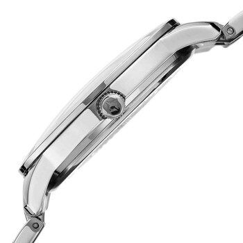 Silver-tone alloy case with a stainless steel bracelet. Fixed silver-tone alloy bezel. Blue dial with silver-tone hands and index hour markers. Minute markers around the outer rim. Dial Type: Analog. Date display below the 12 o'clock position. Quartz movement. Scratch resistant mineral crystal. Pull / push crown. Solid case back. Round case shape. Case size: 44 mm. Case thickness: 12 mm. Band width: 22 mm. Band length: 8.25 inches. Fold over clasp. Water resistant at 30 meters / 100 feet. Functions: hour, minute, second. Womens Casual Series. Casual watch style. Akribos XXIV Womens Casual Quartz Blue Dial Men's Watch P50185.