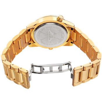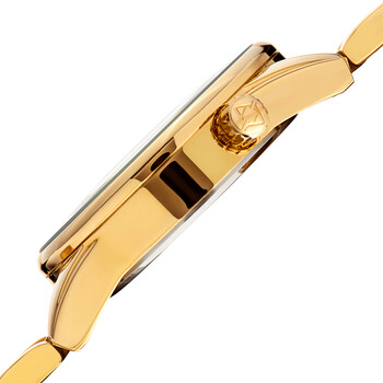 Yellow gold-tone composite metal case with a yellow gold-tone stainless steel bracelet. Fixed gold-tone bezel. Black dial with luminous yellow gold-tone hands and index hour markers. An Arabic numeral appears at the 12 o'clock position. 24 hour markers. GMT (+/-) time zone markings. World markers around the outer rim. Dial Type: Analog. Luminescent hands and markers. Date display at the 6 o'clock position. Quartz movement. Scratch resistant mineral crystal. Pull / push crown. Solid case back. Round case shape. Case size: 41 mm. Case thickness: 12 mm. Band width: 22 mm, band length: 7.5 inches. Butterfly clasp. Water resistant at 30 meters / 100 feet. Functions: dual time, world time, GMT, date, hour, minute, second. Travel watch style. Akribos XXIV World Time Quartz Black Dial Men's Watch AK1021YGB.