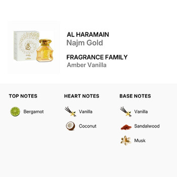 Najm Gold opens with a fresh burst of bergamot, creating a bright and uplifting introduction. As the fragrance settles, the heart reveals a sweet and creamy blend of vanilla and coconut, adding a touch of tropical warmth. Finally, it dries down to a soft, comforting base of rich vanilla, smooth sandalwood, and gentle musk, leaving a lasting impression that’s both elegant and inviting.