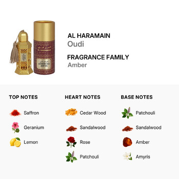 Belonging to the Amber fragrance family, Oudi opens with a bold blend of saffron, geranium, and a touch of lemon, creating an energetic and inviting start. As the scent unfolds, warm heart notes of cedarwood, sandalwood, rose, and patchouli emerge, adding depth and character. Finally, the base notes of patchouli, sandalwood, amber, and amyris provide a smooth, long-lasting finish that lingers beautifully on the skin.