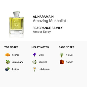 Amazing Mukhallat opens up with the mysterious top notes of incense, cardamom, and juniper, which immediately captivates the senses. The heart notes of orris, jasmine, and labdanum add a sensual and floral touch to the mix, creating a truly mesmerizing fragrance.