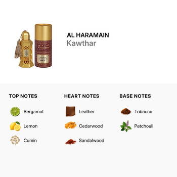 At the first touch, Kawthar opens with fresh, sparkling top notes of bergamot and lemon, lightly spiced with cumin for a crisp and energizing start. As the scent settles, heart notes of warm leather, smooth cedarwood, and creamy sandalwood unfold, creating a rich and earthy middle that adds depth and character. Finally, the fragrance leaves a lasting impression with its base notes of smoky tobacco and aromatic patchouli, bathing the skin in a deep, sensual finish.