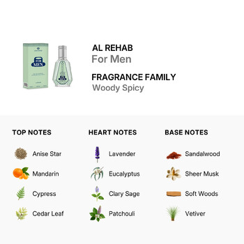 Discover the captivating allure of Al Rehab's niche fragrance, "For Men." Crafted for the discerning gentleman, this exquisite scent is a harmonious blend of nature's most invigorating elements. Imagine stepping into a world where the freshness of anise star and mandarin mingle with the robust earthiness of cypress and cedar leaf. The zesty touch of lemon oil combined with the aromatic essence of thyme creates an unforgettable introduction to this fragrance.