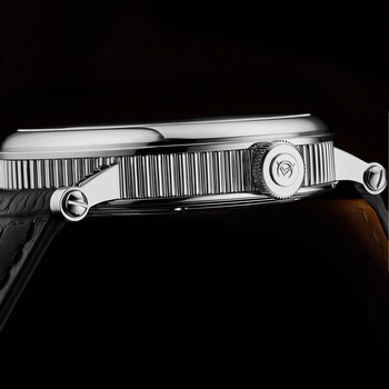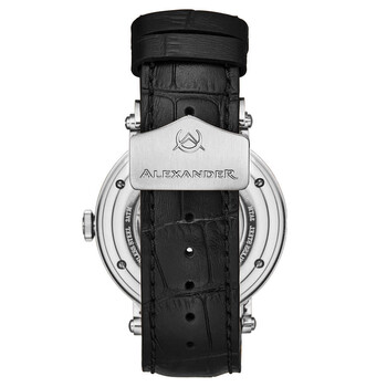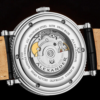 Silver-tone stainless steel case with a black genuine leather strap. Fixed silver-tone stainless steel bezel. Blue dial with silver-tone hands and Roman numeral hour markers. Minute markers around the outer rim. Dial Type: Analog. Date display at the 6 o'clock position. Sellita Caliber SW 200 Automatic movement, based upon ETA 2824-2, containing 26 Jewels, bitting at 28800 vph, and has a power reserve of approximately 38 hours. Scratch resistant sapphire crystal. Pull / push crown. Transparent case back. Round case shape, case size: 43 mm, case thickness: 10.8 mm. Band width: 22 mm, band length: 7.75 inches. Deployment with push button release clasp. Water resistant at 30 meters / 100 feet. Functions: date, hour, minute, second. Alexander 2 Series. Luxury watch style. Watch label: Swiss Made. Alexander Alexander 2 Automatic Blue Dial Men's Watch A153-02.