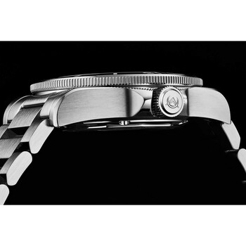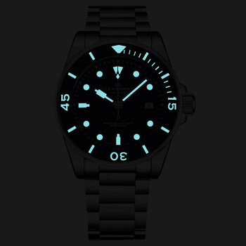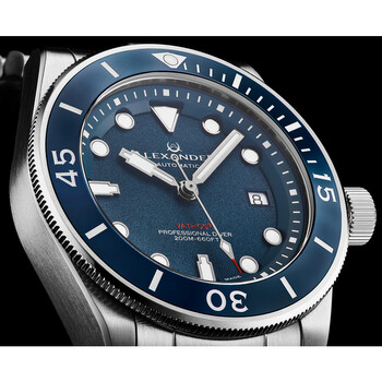 Silver-tone stainless steel case and bracelet. Uni-directional rotating silver-tone ceramic bezel. Blue dial with silver-tone hands and Arabic numeral hour markers. Minute markers around the outer rim. Dial Type: Analog. Luminescent hands and markers. Date display at the 3 o'clock position. Sellita Caliber SW200 Automatic movement, containing 26 Jewels, bitting at 28800 vph, and has a power reserve of approximately 38 hours. Scratch resistant sapphire crystal. Screw down crown. Transparent case back. Round case shape, case size: 42 mm, case thickness: 13.5 mm. Band width: 22 mm, band length: 8 inches. Deployment with push button release clasp. Water resistant at 200 meters / 660 feet. Functions: date, hour, minute, second. Alexander 2 Series. Dive watch style. Watch label: Swiss Made. Alexander Alexander 2 Automatic Blue Dial Men's Watch A520-03.