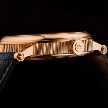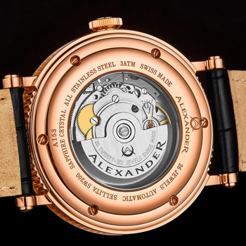 Rose gold-tone stainless steel case with a black genuine leather strap. Fixed rose gold-tone stainless steel bezel. Champagne dial with black hands and Roman numeral hour markers. Minute markers around the outer rim. Dial Type: Analog. Date display at the 6 o'clock position. Sellita Caliber SW 200 Automatic movement, based upon ETA 2824-2, containing 26 Jewels, bitting at 28800 vph, and has a power reserve of approximately 38 hours. Scratch resistant sapphire crystal. Pull / push crown. Transparent case back. Round case shape, case size: 43 mm, case thickness: 10.8 mm. Band width: 22 mm, band length: 7.75 inches. Deployment with push button release clasp. Water resistant at 30 meters / 100 feet. Functions: date, hour, minute, second. Alexander 2 Series. Luxury watch style. Watch label: Swiss Made. Alexander Alexander 2 Automatic Champagne Dial Men's Watch A153-05.