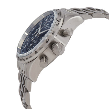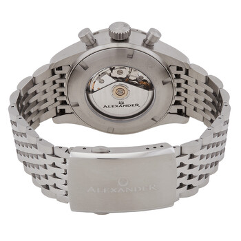 Silver-tone stainless steel case and bracelet. Fixed silver-tone stainless steel bezel. Blue dial with silver-tone hands and Arabic numeral hour markers. Minute markers around the outer rim. Dial Type: Analog. Luminescent hands and markers. Date display at the 6 o'clock position. Chronograph - three sub-dials displaying: 60 second, 30 minute and 12 hour. ETA-Valjoux Caliber 7753 Automatic movement, based upon ETA 7750, containing 27 Jewels, bitting at 28800 vph, and has a power reserve of approximately 44 hours. Scratch resistant sapphire crystal. Screw down crown. Transparent case back. Round case shape, case size: 43 mm, case thickness: 15.5 mm. Band width: 22 mm, band length: 8 inches. Deployment with push button release clasp. Water resistant at 100 meters / 330 feet. Functions: chronograph, date, hour, minute, second. Alexander 2 Series. Luxury watch style. Watch label: Swiss Made. Alexander Alexander 2 Chronograph Automatic Blue Dial Men's Watch A480-LE.