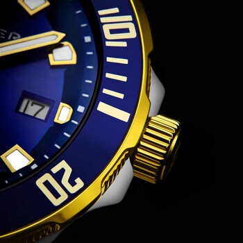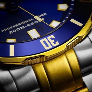 Multi-color stainless steel case with a two-tone (silver-tone and yellow gold-tone) stainless steel bracelet. Uni-directional rotating blue stainless steel bezel. Blue dial with gold-tone hands and Arabic numeral hour markers. Minute markers around the outer rim. Dial Type: Analog. Luminescent hands and markers. Date display at the 3 o'clock position. Ronda Caliber 715 quartz movement. Scratch resistant sapphire crystal. Screw down crown. Solid case back. Round case shape, case size: 42 mm, case thickness: 11 mm. Band width: 22 mm, band length: 8 inches. Deployment with push button release clasp. Water resistant at 200 meters / 660 feet. Functions: date, hour, minute, second, battery eol indicator. Alexander 2 Series. Dive watch style. Watch label: Swiss Made. Alexander Alexander 2 Quartz Blue Dial Men's Watch A501B-03.