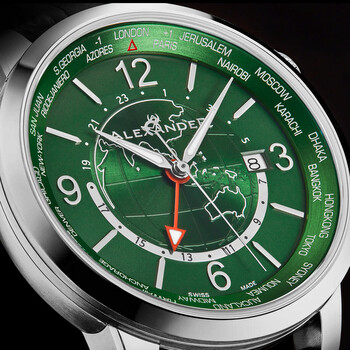 Silver-tone stainless steel case and bracelet. Fixed silver-tone stainless steel bezel. Green dial with silver-tone hands and Roman numeral & index hour markers. Minute markers around the outer rim. Dial Type: Analog. Luminescent hands and markers. Date display at the 3 o'clock position. Ronda Caliber 515.24H quartz movement. Scratch resistant sapphire crystal. Pull / push crown. Solid case back. Round case shape, case size: 42 mm, case thickness: 9 mm. Band width: 22 mm, band length: 8 inches. Deployment with push button release clasp. Water resistant at 50 meters / 165 feet. Functions: date, GMT, second time zone, hour, minute, second. Alexander 2 Series. Dress watch style. Watch label: Swiss Made. Alexander Alexander 2 Quartz Green Dial Men's Watch A171B-04.