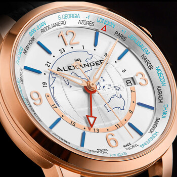 Rose gold-tone stainless steel case and bracelet. Fixed rose gold-tone stainless steel bezel. Silver-tone dial with rose gold-tone hands and Roman numeral & index hour markers. Dial Type: Analog. Luminescent hands. Date display at the 3 o'clock position. Ronda Caliber 515.24H quartz movement. Scratch resistant sapphire crystal. Pull / push crown. Solid case back. Round case shape, case size: 42 mm, case thickness: 9 mm. Band width: 22 mm, band length: 8 inches. Deployment with push button release clasp. Water resistant at 50 meters / 165 feet. Functions: date, GMT, second time zone, hour, minute, second. Alexander 2 Series. Dress watch style. Watch label: Swiss Made. Alexander Alexander 2 Quartz Silver Dial Men's Watch A171B-02.