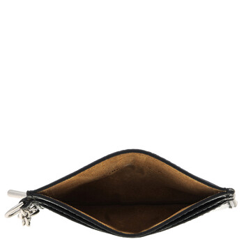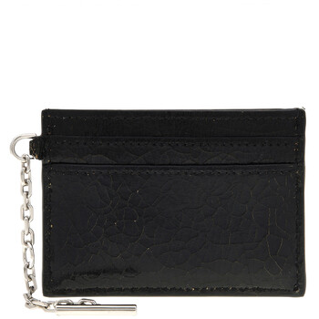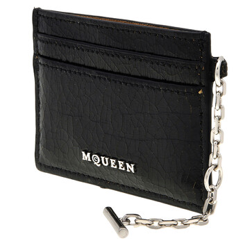 Alexander McQueen Men's Card Case. SKU: 805063 1AAUE 9769. Barcode: 3666582725396. Color: Black/Caramel/Silver. Size: Length 10 x Height 7 x Depth 0.1 cm / 3.9 x 2.7 x 0.03 inches. Alexander Mcqueen Black / Caramel / Silver Men's T-Bar Card Holder. Handcrafted from shiny black cracked leather, this accessory features a central compartment and internal card slots for practical organization. It is finished with a silver-tone metal chain, engraved with the McQueen logo, adding a signature touch. The piece can be attached to the Sling and T-Bar bags for versatile styling. It includes one central compartment, four card slots, McQueen metal lettering, and a shiny silver-finished chain with an engraved metal T-Bar detail. Material: Calf Leather. Made in Italy.