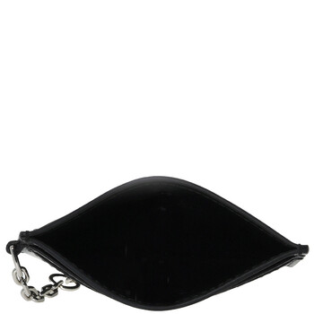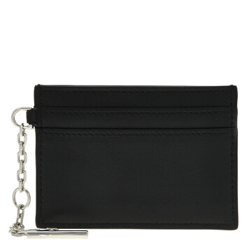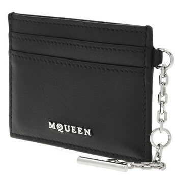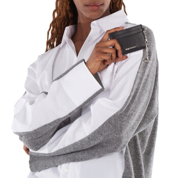 Alexander McQueen Ladies Card Case. SKU: 804434 1T1AN 1000. Barcode: 3666582721060. Color: Black/Silver. Size: Length 10 x Height 7 x Depth 0.1 cm / 3.9 x 2.7 x 0.03 inches. Alexander Mcqueen Black / Silver Ladies T-Bar Card Holder. Handcrafted from smooth calf leather, this piece features a central compartment for secure storage, along with four internal card slots for added organization. It is finished with a shiny silver-tone metal chain, engraved with the McQueen logo, adding a touch of luxury. The design also includes McQueen metal lettering and a metal T-Bar with an engraved finish, completing the sophisticated look. Material: Calf Leather. Made in Italy.