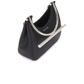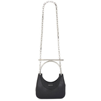Alexander McQueen Ladies Crossbody. SKU: 803525 1VDBB 1000. Barcode: 3666582720544. Color: Black/Silver. Size: Length 20 x Height 17.5 x Depth 6 cm / 7.8 x 6.8 x 2.3 inches. Alexander Mcqueen Ladies Black / Silver Mini T-Bar Bag. The McQueen Mini T-Bar Bag, made from black lamb leather, features a structured body with pleated sides and a striking circular T-Bar handle in silver-tone metal, engraved with the McQueen logo. It offers versatility, allowing it to be carried by hand or worn crossbody with the detachable silver-tone chain strap, which has a drop of 55 cm (21 inches). The bag is secured with a magnet fastening and includes one central compartment, an internal card slot with a metal D-ring, and a luxurious Nappa leather lining. Additional details include silver-finished hardware and McQueen metal lettering. The T-Bar handle measures 17 cm (6.6 inches) in length. Material: Lambskin. Made in Italy.