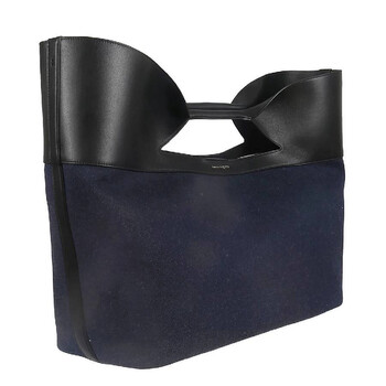 Alexander McQueen Ladies Tote. SKU: 709344 1AAI5 4090. Color: Denim+Black. Size: W: 54.5cm, H: 41.5cm, D: 21.5cm. Alexander Mcqueen Logo-Print Bow Detailed Bag. This bag features a bow-detailed wrist handle, a logo print, a spacious main compartment, and cotton lining. Material: 70% Cotton, 30% Leather. Made in Italy.
