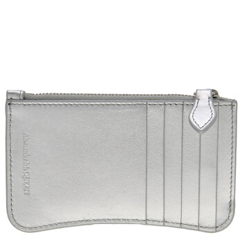 Alexander McQueen Ladies Wallets. SKU: 779225 1BL0I 1400. Barcode: 3666582604080. Color: Light Silver. Size: Width: 13cm x Height: 7.5cm. Alexander Mcqueen Seal Card Holder. This cardholder features a zip card holder with an embossed logo seal and logo lettering on the back. It includes five credit card slots for added functionality. 100% calf leather. Made in Italy.