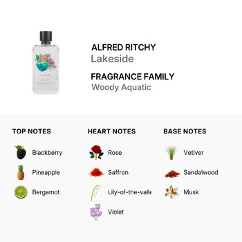 Lakeside opens with a fresh burst of juicy blackberry, tropical pineapple, and zesty bergamot. These vibrant top notes awaken the senses and set the stage for a heart that blooms with elegance. The middle notes of romantic rose, golden saffron, delicate lily-of-the-valley, and soft violet create a floral harmony that adds depth and charm to the fragrance.
