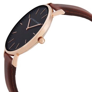 Gold-tone brass case with a brown leather strap. Fixed gold-tone brass bezel. Black dial with gold-tone hands and index hour markers. Minute markers around the outer rim. Dial Type: Analog. Quartz movement. Scratch resistant mineral crystal. Pull / push crown. Solid case back. Round case shape, case size: 41 mm. Band width: 18 mm. Buckle clasp. Water resistant at 30 meters / 100 feet. Functions: hour, minute. Ultra Slim Series. Casual watch style. Watch label: Japan Movt. Alfred Sung Ultra Slim Quartz Black Dial Watch AS7003RL-5A1.