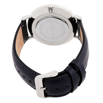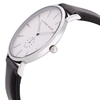 Silver-tone brass case with a black leather strap. Fixed silver-tone brass bezel. White dial with index hour markers. Dial Type: Analog. One subdial displaying: small second. Quartz movement. Pull / push crown. Solid case back. Round case shape, case size: 41 mm. Band width: 18 mm. Buckle clasp. Water resistant at 30 meters / 100 feet. Functions: hour, minute, small second. Ultra Slim Series. Casual watch style. Watch label: Japan Movt. Alfred Sung Ultra Slim Quartz White Dial Men's Watch AS7105SL-1A7.
