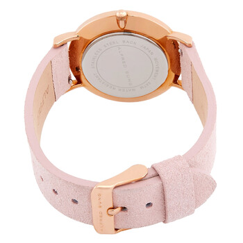 Gold-tone brass case with a pink suede band. Fixed gold-tone brass bezel. White dial with gold-tone hands and index hour markers. Dial Type: Analog. Quartz movement. Pull / push crown. Solid case back. Round case shape, case size: 36 mm. Band width: 18 mm. Buckle clasp. Water resistant at 30 meters / 100 feet. Functions: hour, minute, second. Ultra Slim Series. Casual watch style. Watch label: Japan Movt. Alfred Sung Ultra Slim Quartz White Dial Watch AS4000RSD-4A.