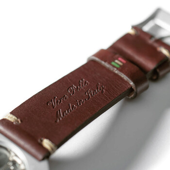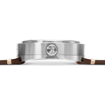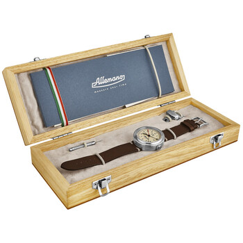 Silver-tone stainless steel case with a brown leather strap. Fixed silver-tone stainless steel bezel. White dial with black hands and Arabic numeral & index hour markers. Minute markers around the outer rim. Dial Type: Analog. Date display at the 3 o'clock position. Automatic movement. Scratch resistant sapphire crystal. Pull / push crown. Transparent case back. Round case shape, case size: 44 mm, case thickness: 12 mm. Band width: 22 mm, band length: 8 inches. Tang clasp. Water resistant at 50 meters / 165 feet. Functions: date, hour, minute, second. Additional Info: hours, minutes and seconds hands. date and second time zone. 1919 Gmt Series. Luxury watch style. Allemano 1919 GMT Automatic White Dial Men's Watch GMT A 1919 SP-PW.