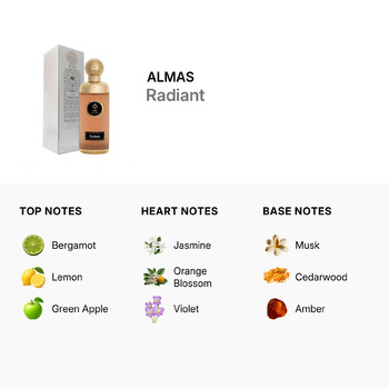 Packaged in a sleek 6.7 oz bottle, Radiant by Almas is a premium fragrance choice that reflects the artistry and passion of Middle Eastern perfumery. With its unique combination of freshness and warmth, it's more than just a scent—it's a radiant experience for anyone who wears it.
