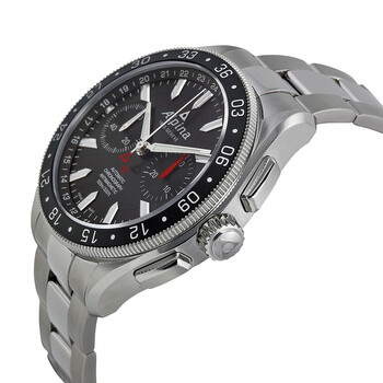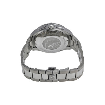 Stainless steel case with a stainless steel bracelet. Bi-directional rotating stainless steel bezel showing compass markings. Black dial with luminous silver-tone hands and index hour markers. Minute markers. 24 hour (GMT) markers around the outer rim. Dial Type: Analog. Luminescent hands and markers. Chronograph - two sub-dials displaying: 60 second and 30 minute. Alpina calibre AL-860 automatic movement, containing 26 Jewels, bitting at 28800 vph, and has a power reserve of approximately 38 hours. Scratch resistant sapphire crystal. Screw down crown. Solid case back. Round case shape. Case size: 44 mm. Case thickness: 15 mm. Band width: 20 mm. Band length: 9 inches. Deployment clasp. Water resistant at 100 meters / 330 feet. Functions: chronograph, hour, minute, second, 24 hour, antimagnetic, antishock. Luxury watch style. Watch label: Swiss Made. Item Variations: AL 860B5AQ6B, AL.860B5AQ6B, AL860B5AQ6B. Alpina 4 Chronograph Automatic Black Dial Steel Men's Watch AL-860B5AQ6B.
