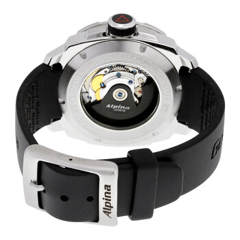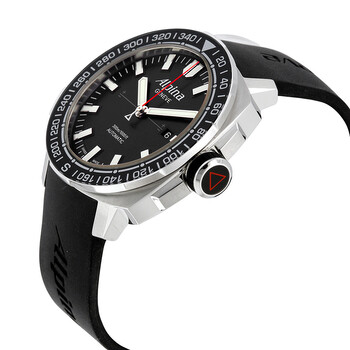 Stainless steel case with a black rubber strap. Uni-directional rotating stainless steel bezel with a black PVD top ring. Black dial with silver-tone hands and index hour markers. Minute markers around the outer rim. Dial Type: Analog. Luminescent hands and markers. Date display at the 3 o'clock position. Automatic movement with a 38 hour reserve. Scratch resistant sapphire crystal. Screw down crown. Transparent screw down case back. Case diameter: 44 mm. Case thickness: 13 mm. Round case shape. Deployment clasp. Water resistant at 300 meters / 1000 feet. Functions: date, hour, minute, second. Luxury watch style. Watch label: Swiss Made. Alpina Adventure Extreme Sailing Black Dial Black Rubber Strap AL525LB4V6.