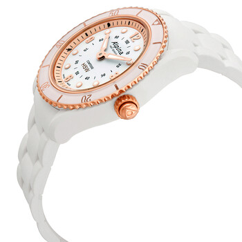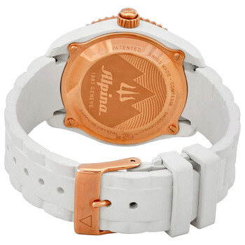 White glass fiber case with a white rubber strap. Rose gold-tone bezel with a white ring. White dial with luminous rose gold-tone hands and dot hour markers. Arabic numerals mark the 3, 6, 9 and 12 o'clock positions. Minute markers around the outer rim. Dial Type: Analog. Luminescent hands and markers. Alpina calibre MMT-281 quartz movement. Scratch resistant sapphire crystal. Pull / push crown. Round case shape. Case size: 36 mm. Case thickness: 11 mm. Band width: 17 mm. Tang clasp. Water resistant at 100 meters / 330 feet. Functions: hour, minute, second, notifications, activity tracking, sleep monitoring, always-on time, sleep cycle alarms, get- active alerts, dynamic coaching, cloud backup and restore & worldtimer 24 time zones. Additional Info: all functions adjustable via the crown. Smart watch style. Watch label: Swiss Made. Alpina Alarm Quartz White Dial Ladies Smart Watch AL-281WY3V4.