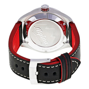 Stainless steel case with a black leather strap. Uni-directional rotating stainless steel bezel. Black dial with luminous silver-tone hands and index hour markers. Minute markers around the outer rim. Dial Type: Analog. Luminescent hands and markers. Date display at the 3 o'clock position. Alpina calibre AL-525 automatic movement, based upon Sellita SW200-1, containing 26 Jewels, bitting at 28800 vph, and has a power reserve of approximately 38 hours. Scratch resistant sapphire crystal. Screw down crown. Solid case back. Round case shape. Case size: 44 mm. Case thickness: 13 mm. Band width: 22 mm. Tang clasp. Water resistant at 100 meters / 330 feet. Functions: date, hour, minute, second. Alpiner 4 Series. Dress watch style. Watch label: Swiss Made. Alpina Alpiner 4 Automatic Black Dial Men's Watch 525BS5AQ6.