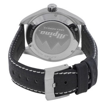 Silver-tone stainless steel case with a black leather strap. Bi-directional rotating silver-tone stainless steel with a black top ring bezel. Black dial with luminous silver-tone hands and index hour markers. Minute markers around the outer rim. Dial Type: Analog. Luminescent hands and markers. Date display at the 3 o'clock position. Alpina Calibre AL-525 Automatic movement, based upon Sellita SW200-1, containing 26 Jewels, bitting at 28800 vph, and has a power reserve of approximately 38 hours. Scratch resistant convex sapphire crystal. Screw down crown. Solid case back. Round case shape, case size: 44 mm, case thickness: 13.5 mm. Band width: 20/22 mm. Tang clasp. Water resistant at 100 meters / 330 feet. Functions: date, hour, minute, second. Alpiner 4 Series. Dress watch style. Watch label: Swiss Made. Alpina Alpiner 4 Automatic Black Dial Men's Watch AL-525BR5AQ6-SR.