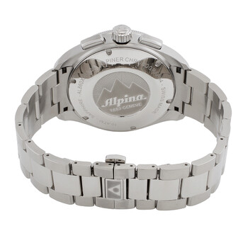 Stainless steel case with a stainless steel bracelet. Bi-directional rotating stainless steel bezel. Blue dial with luminous silver-tone hands and index hour markers. Minute markers. 24 hour markers around the outer rim. Dial Type: Analog. Luminescent hands and markers. Chronograph - two sub-dials displaying: 60 second and 30 minute. Alpina calibre AL-860 automatic movement, containing 26 Jewels, bitting at 28800 vph, and has a power reserve of approximately 38 hours. Scratch resistant sapphire crystal. Screw down crown. Solid case back. Round case shape. Case size: 44 mm. Fold over clasp. Water resistant at 100 meters / 330 feet. Functions: chronograph, date, hour, minute, second. Alpiner 4 Series. Sport watch style. Watch label: Swiss Made. Alpina Alpiner 4 Chronograph Automatic Blue Dial Men's Watch AL-860LNS5AQ6B.