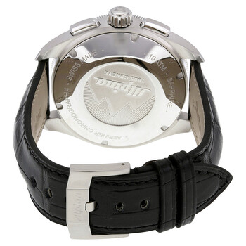 Stainless steel case with a black leather strap. Bi-directional rotating stainless steel bezel with a black top ring showing compass markers. Silver dial with luminous silver-tone hands and index hour markers. Minute markers.24 hour markers around the outer rim. Dial Type: Analog. Luminescent hands and markers. Chronograph - two sub-dials displaying: 60 second and 30 minute. Automatic movement with a 46 hour power reserve. Scratch resistant sapphire crystal. Screw down crown. Solid case back. Case diameter: 44 mm. Case thickness: 15 mm. Round case shape. Band width: 22 mm. Band length: 9 inches. Tang clasp. Water resistant at 100 meters / 330 feet. Functions: chronograph, hour, minute, second, 24 hour, antimagnetic, antishock. Luxury watch style. Watch label: Swiss Made. Item Variations: AL 860S5AQ6, AL.860S5AQ6, AL860S5AQ6. Alpiner 4 Chronograph Automatic Silver Dial Black Leather Men's Watch AL-860S5AQ6.