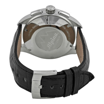 Stainless steel case with a black leather strap. Bi-directional rotating stainless steel bezel with a black top ring showing compass markings. Silver dial with blue and silver-tone hands and index hour markers. Minute markers. 24 hour markers around the outer rim. Dial Type: Analog. Luminescent hands and markers. Chronograph - two sub-dials displaying: 60 second and 30 minute. Automatic movement with a 46 hour power reserve. Scratch resistant sapphire crystal. Screw down crown. Skeleton case back. Case diameter: 44 mm. Round case shape. Tang clasp. Water resistant at 100 meters / 330 feet. Functions: chronograph, hour, minute, second, 24 hour, antimagnetic, antishock. Luxury watch style. Watch label: Swiss Made. Alpina Alpiner 4 Chronograph Automatic Silver Dial Leather Men's Watch AL-860AD5AQ6.