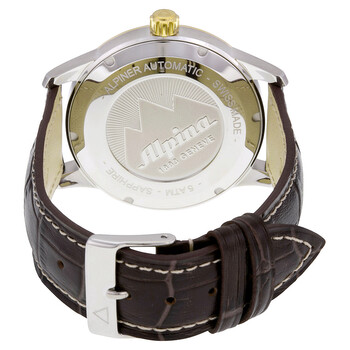 Stainless steel case with a brown leather strap. Fixed yellow gold-plated bezel. Silver dial with luminous yellow gold-tone hands and alternating index and Arabic numeral hour markers. Minute markers around the outer rim. Dial Type: Analog. Luminescent hands. Date display above the 6 o'clock position. Alpina calibre AL-525 automatic movement, based upon Sellita SW200-1, containing 26 Jewels, bitting at 28800 vph, and has a power reserve of approximately 38 hours. Scratch resistant sapphire crystal. Screw down crown. Solid case back. Round case shape. Case size: 41.5 mm. Case thickness: 14 mm. Band width: 21 mm / 18 mm. Band length: 8 inches. Tang clasp. Water resistant at 50 meters / 165 feet. Functions: date, hour, minute, second. Dress watch style. Watch label: Swiss Made. Item Variations: AL 525S4E3, AL.525S4E3, AL525S4E3. Alpina Alpiner Automatic Silver Dial Brown Leather Men's Watch AL-525S4E3.