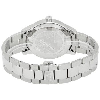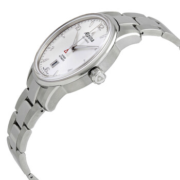 Silver-tone stainless steel case with a silver-tone stainless steel bracelet. Fixed silver-tone stainless steel bezel. Silver dial with silver-tone hands and alternating index and Arabic numera hour markers. Minute markers around the outer rim. Dial Type: Analog. Luminescent hands. Date display at the 6 o'clock position. Alpina Calibre AL-525 Automatic movement, based upon Sellita SW200-1, containing 26 Jewels, bitting at 28800 vph, and has a power reserve of approximately 38 hours. Scratch resistant sapphire crystal. Pull / push crown. Solid case back. Round case shape. Case size: 41.5 mm. Band width: 21-18 mm. Deployment clasp. Water resistant at 50 meters / 165 feet. Functions: date, hour, minute, second. Dress watch style. Watch label: Swiss Made. Item Variations: AL 525S4E6B, AL.525S4E6B, AL525S4E6B. Alpina Alpiner Automatic Silver Dial Stainless Steel Men's Watch AL-525S4E6B.