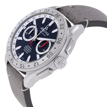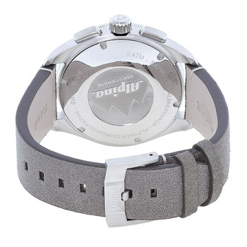 Silver-tone stainless steel case with a grey leather strap. Bi-directional rotating silver-tone stainless steel bezel. Grey dial with silver-tone hands and Arabic numeral & index hour markers. Minute markers around the outer rim. Dial Type: Analog. Luminescent hands and markers. Chronograph - two sub-dials displaying: 60 second and 30 minute. Alpina Calibre AL-860 Automatic movement, containing 26 Jewels, bitting at 28800 vph, and has a power reserve of approximately 38 hours. Scratch resistant sapphire crystal. Solid case back. Round case shape, case size: 44 mm, case thickness: 15.7 mm. Band width: 22 mm, band length: 8 inches. Tang clasp. Water resistant at 100 meters / 330 feet. Functions: chronograph, hour, minute, second. Additional Info: hours, minutes, seconds, chronograph. Alpiner Series. Luxury watch style. Watch label: Swiss Made. Alpina Alpiner Chronograph Automatic Grey Dial Men's Watch AL-860DGS5AQ6-BF.