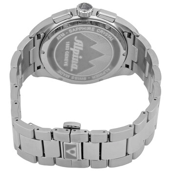 Silver-tone stainless steel case and bracelet. Fixed silver-tone stainless steel bezel. Black dial with silver-tone hands and index hour markers. Arabic numeral minute markers (at 5 minute intervals). Minute markers around the outer rim. Dial Type: Analog. Luminescent hands and markers. Date display at the 6 o'clock position. Chronograph - three sub-dials displaying: 60 second, 30 minute and 12 hour. Quartz movement. Scratch resistant sapphire crystal. Screw down crown. Solid case back. Round case shape, case size: 42 mm, case thickness: 10.9 mm. Fold over clasp with a safety release. Water resistant at 100 meters / 330 feet. Functions: chronograph, date, hour, minute, second. Alpiner Series. Luxury watch style. Watch label: Swiss Made. Alpina Alpiner Chronograph Quartz Black Dial Men's Watch AL-373BB4E6B.