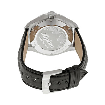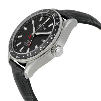 Stainless steel case with a black leather strap. Bi-directional rotating bezel with compass function. Black dial with silver-tone hands and index hour markers. Minute markers. 24 hour markers around the outer rim. Dial Type: Analog. Luminescent hands and markers. Date display at the 3 o'clock position. Automatic movement. Scratch resistant sapphire crystal. Skeleton case back. Case diameter: 44 mm. Round case shape. Tang clasp. Water resistant at 100 meters / 330 feet. Functions: date, GMT, second time zone, hour, minute, second, 24 hours, antimagnetic, antishock. Luxury watch style. Watch label: Swiss Made. Alpina Alpiner GMT 4 Automatic Black Dial Black Leather Men's Watch AL-550G5AQ6.