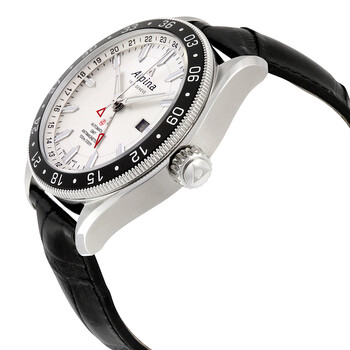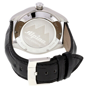 Stainless steel case with a black leather strap. Bi-directional rotating stainless steel bezel showing compass markings. Silver dial with luminous silver-tone hands and index hour markers. Minute markers. 24 hour (GMT) markers around the outer rim. Dial Type: Analog. Luminescent hands and markers. Date display at the 3 o'clock position. Alpina calibre AL-550 automatic movement, based upon Sellita SW 200, containing 26 Jewels, bitting at 28800 vph, and has a power reserve of approximately 38 hours. Scratch resistant sapphire crystal. Screw down crown. Solid case back. Round case shape. Case size: 44 mm. Case thickness: 15 mm. Band width: 21 mm / 18 mm, band length: 9 inches. Tang clasp. Water resistant at 100 meters / 330 feet. Functions: date, GMT, second time zone, hour, minute, second, 24 hours, antimagnetic, antishock. Luxury watch style. Watch label: Swiss Made. Item Variations: AL 550S5AQ6, AL.550S5AQ6, AL550S5AQ6. Alpina Alpiner GMT 4 Automatic Silver Dial Black Leather Men's Watch AL-550S5AQ6.
