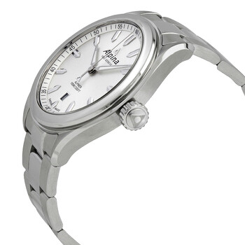 Stainless steel case with a stainless steel bracelet. Fixed stainless steel bezel. Silver dial with luminous silver-tone hands and index hour markers. Minute markers around the outer rim. Dial Type: Analog. Luminescent hands and markers. Date display at the 6 o'clock position. Alpina calibre AL-240 quartz movement. Scratch resistant sapphire crystal. Screw down crown. Solid case back. Round case shape. Case size: 42 mm. Case thickness: 9.4 mm. Band width: 22 mm. Deployment clasp. Water resistant at 100 meters / 330 feet. Functions: date, hour, minute, second. Casual watch style. Watch label: Swiss Made. Alpina Alpiner Silver Dial Quartz Men's Watch AL-240SS4E6B.