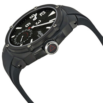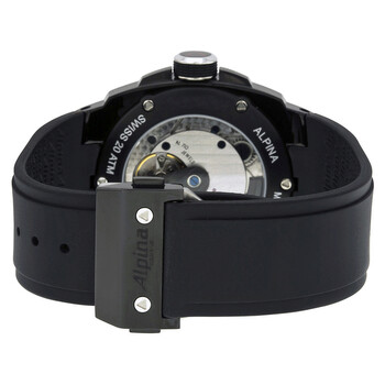 Black PVD stainless steel case with a black rubber strap. Fixed black PVD bezel. Black dial with silver-tone minute hand and minute markers. 12 hour sub-dial. Dial Type: Analog. Luminescent hands and markers. Date display at the 6 o'clock position. Date sub-dial. Alpina calibre AL-950 automatic movement, containing 25 Jewels, composed of 129 parts, bitting at 28800 vph, and has a power reserve of approximately 48 hours. Scratch resistant sapphire crystal. Screw down crown. Transparent case back. Round case shape. Case size: 46 mm. Case thickness: 13 mm. Tang clasp. Water resistant at 200 meters / 660 feet. Functions: date, hour, minute,. Startimer Pilot Series. Casual watch style. Watch label: Swiss Made. Alpina Automatic Black Dial Black Rubber Men's Watch 950LBB4FBAE6.