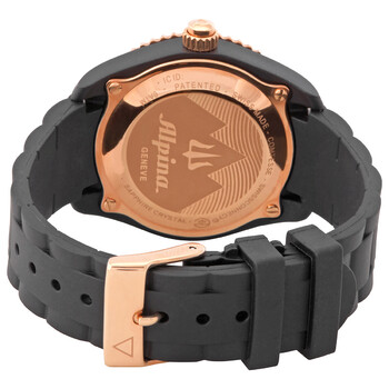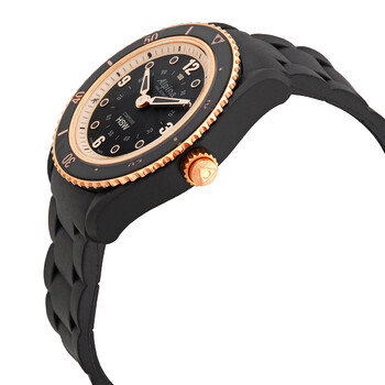 Black PVD fibre glass case with a black rubber strap. Uni-directional rotating rose gold PVD bezel with a black PVD ring. Black dial with rose gold-tone hands and dot hour markers. Arabic numerals mark the 3, 6, 9 and 12 o'clock positions. Minute markers around the outer rim. Dial Type: Analog. Luminescent markers. Alpina calibre MMT-281 quartz movement. Scratch resistant sapphire crystal. Pull / push crown. Solid case back. Round case shape. Case size: 36 mm. Case thickness: 11 mm. Band width: 18 mm. Tang clasp. Water resistant at 100 meters / 330 feet. Functions: date, hour, minute, activity tracking, sleep monitoring, sleep cycle alarms, get-active alerts, dynamic coaching, cloud backup and restore, worldtimer, notifications. Casual watch style. Watch label: Swiss Made. Alpina Black Dial Ladies Horological Smart Watch AL-281BY3V4.