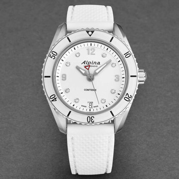 Silver-tone stainless steel case with a white rubber strap. Fixed silver-tone stainless steel bezel. Silver-tone dial with silver-tone hands and diamond hour markers. Minute markers around the outer rim. Dial Type: Analog. Luminescent hands. Date display at the 6 o'clock position. Quartz movement. Scratch resistant sapphire crystal. Solid case back. Round case shape, case size: 37 mm. Tang clasp. Water resistant at 60 meters / 200 feet. Functions: date, hour, minute, second. Comtesse Series. Luxury watch style. Watch label: Swiss Made. Alpina Comtesse Quartz Diamond Silver Dial Ladies Watch AL-240SD3C6.