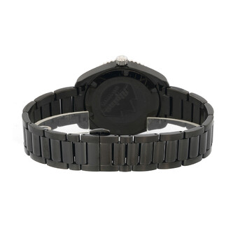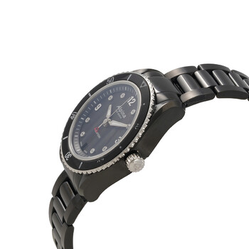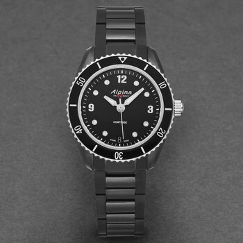 Black PVD stainless steel case and bracelet. Uni-directional rotating stainless steel bezel with an inlaid black ring. Black dial with luminous silver-tone hands and diamond hour markers. Arabic numerals appear at the 3, 9 and 12 o'clock positions. Minute markers around the outer rim. Dial Type: Analog. Luminescent hands. Date display at the 6 o'clock position. Alpina calibre AL-240 quartz movement. Scratch resistant sapphire crystal. Pull / push crown. Solid case back. Round case shape. Case size: 37 mm. Case thickness: 10 mm. Band width: 18 mm. Fold over clasp with a push button release. Water resistant at 60 meters / 190 feet. Functions: date, hour, minute, second. Comtesse Sport Series. Dress watch style. Watch label: Swiss Made. Alpina Comtesse Sport Quartz Black Dial Ladies Watch AL-240BD3FBC6B.