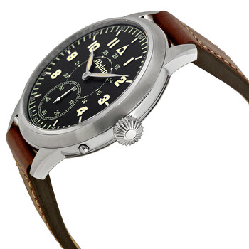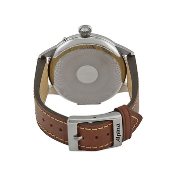 Silver-tone stainless steel case with a brown leather strap. Fixed silver-tone stainless steel bezel. Black dial with grey hands and Arabic numeral hour markers. Alpina logo marks the 12 o'clock position. 24 hour markers. minute markers around the outer rim. Dial Type: Analog. Luminescent hands and markers. One subdial displaying: small second at the 6 o'clock position. Alpina Calibre AL-435 Hand Wind movement, based upon Unitas 6498, containing 17 Jewels, bitting at 18000 vph, and has a power reserve of approximately 46 hours. Scratch resistant sapphire crystal. Screw down crown. Transparent sapphire case back. Round case shape, case size: 50 mm, case thickness: 12 mm. Band width: 22 mm, band length: 8 inches. Tang clasp. Water resistant at 30 meters / 100 feet. Functions: hour, minute, small second. Heritage Mk II Series. Pilot watch style. Watch label: Swiss Made. Item Variations: AL 435LB4SH6, AL.435LB4SH6, AL435LB4SH6. Alpina Heritage MK II Pilot Black Dial Brown Leather Men's Watch AL-435LB4SH6.