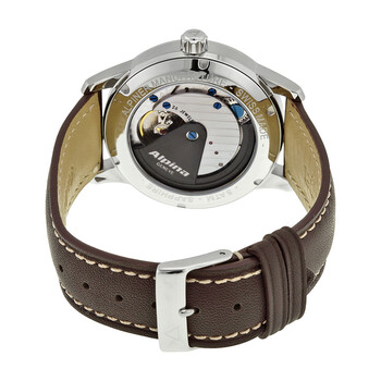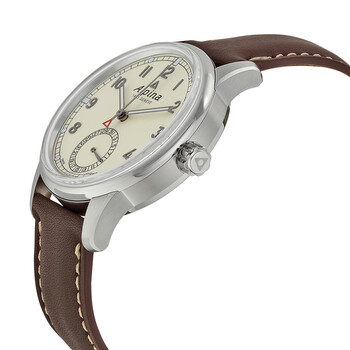 Silver-tone stainless steel case with a brown leather strap. Fixed silver-tone stainless steel bezel. Cream opaline dial with luminous silver-tone hands and Arabic numeral hour markers. Minute markers around the outer rim. Dial Type: Analog. Luminescent hands. Date display at the 6 o'clock position. One subdial displaying: date. Alpina Calibre AL-710 automatic movement with a 46-hour power reserve. Scratch resistant sapphire crystal. Transparent case back. Round case shape, case size: 41.5 mm. Band width: 21-18 mm. Tang clasp. Water resistant at 50 meters / 165 feet. Functions: date, hour, minute, second. Alpiner Manufacture Series. Luxury watch style. Watch label: Swiss Made. Item Variations: AL 710KM4E6, AL.710KM4E6, AL710KM4E6. Alpina Manufacture "Tribute To Alpina Kim" Cream Opaline Dial Brown Leather Men's Watch AL-710KM4E6.