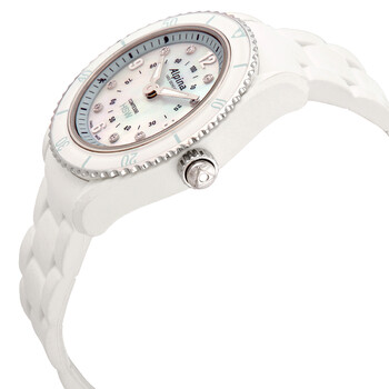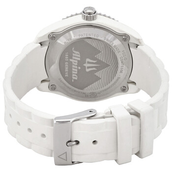 White fiber glass case with a white rubber strap. Uni-directional rotating white bezel with an inlaid white ring. Mother of pearl dial with luminous silver-tone hands and diamond hour markers. Arabic numerals mark the 3, 6, 9 and 12 o'clock positions. 1/100th markers. Minute markers around the outer rim. Dial Type: Analog. Luminescent hands and markers. Alpina calibre MMT-281-1 quartz movement. Scratch resistant sapphire crystal. Solid case back. Round case shape. Case size: 36 mm. Case thickness: 11 mm. Band width: 16 mm. Tang clasp. Water resistant at 100 meters / 330 feet. Functions: date, hour, minute, activity tracking, sleep monitoring, sleep cycle alarms, get-active alerts, dynamic coaching, cloud backup and restore, worldtimer, notifications. Smart watch style. Watch label: Swiss Made. Alpina Mother of Pearl Diamond Dial Ladies Horlogical Smartwatch AL281MPWND3V6.