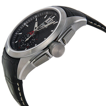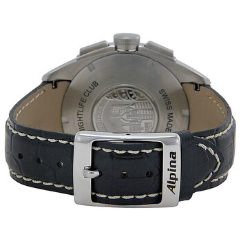 Stainless steel case with a black (calfskin) leather strap. Fixed stainless steel bezel. Black dial with luminous silver-tone hands and index hour markers. Minute markers around the outer rim. Dial Type: Analog. Luminescent hands and markers. Date display at the 12 o'clock position. One combination chronograph sub-dial displaying: 60 seconds, 30 minutes and 12 hours. Swiss quartz movement. Scratch resistant anti-reflective sapphire crystal. Screw down crown. Screw-in case back. Case diameter: 44 mm. Case thickness: 11 mm. Round case shape. Band width: 24 mm. Tang clasp. Water resistant at 100 meters / 330 feet. Functions: chronograph, date, hour, minute, second. Luxury watch style. Watch label: Swiss Made. Alpina Nightlife Club Chronograph Black Dial Leather Strap Men's Watch AL353B4RC6.