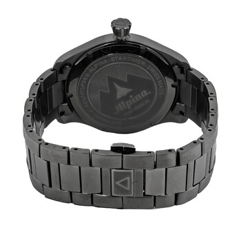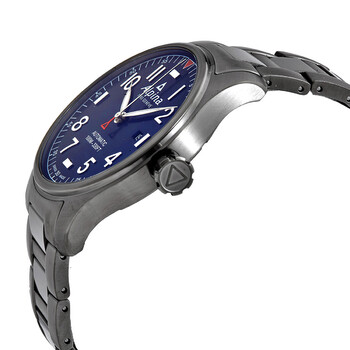 Black DLC titaninum stainless steel case and bracelet. Fixed black DLC bezel. Blue dial with luminous silver-tone leaf-style hands and Arabic numeral hour markers. Index markers at the 3, 6, 9 and 12 o'clock positions. Arabic numeral minute markers (at 5 minute intervals). Minute markers around the inner rim. Dial Type: Analog. Luminescent hands and markers. Date display at the 3 o'clock position. Alpina calibre AL-525 automatic movement, based upon Sellita SW200-1, containing 26 Jewels, bitting at 28800 vph, and has a power reserve of approximately 38 hours. Scratch resistant sapphire crystal. Screw down crown. Solid case back. Round case shape. Case size: 44 mm. Case thickness: 11 mm. Band width: 22 mm. Fold over clasp. Water resistant at 100 meters / 330 feet. Functions: date, hour, minute, second. Casual watch style. Watch label: Swiss Made. Alpina Pilot Automatic Blue Dial Titaninum Stainless Steel Men's Watch AL-525NN4TS6B.